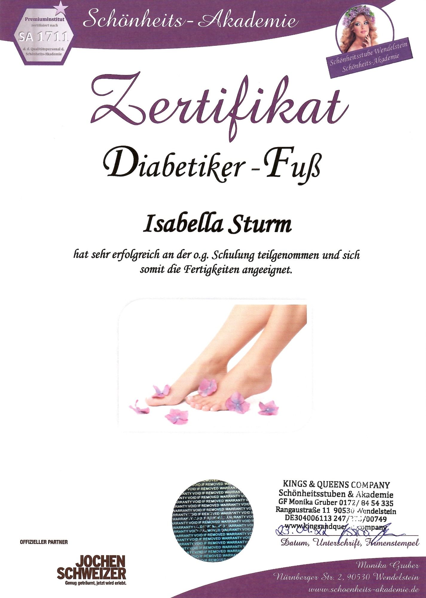 - geprüfte Arbeitsweise nach SA1711 Ausführen der komplementär med. Fachfußpflege